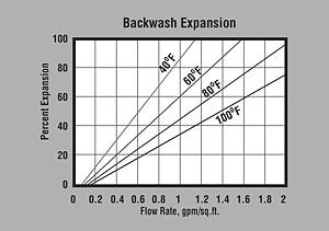 | BACKWASH — After each cycle the resin bed should be backwashed at a rate that expands the bed 25 to 50 percent. The graph above shows the expansion characteristics as a function of flow rate at various temperatures. |